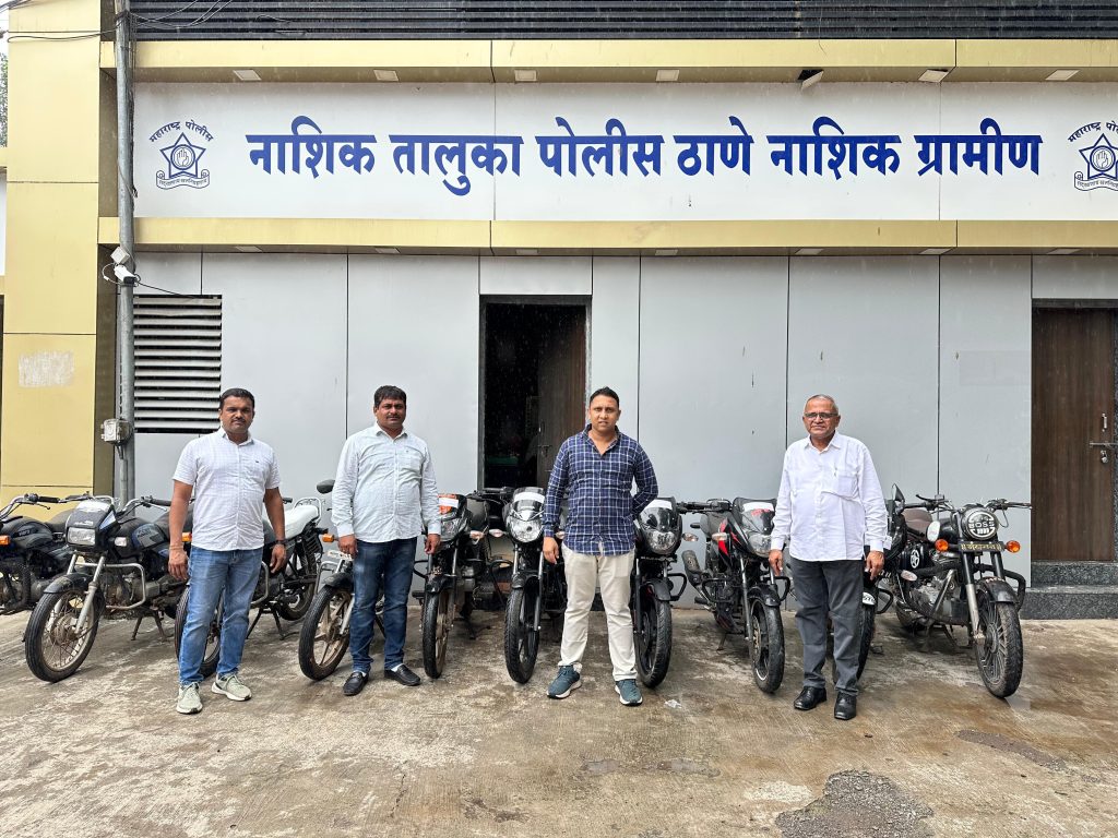 नाशिक जिल्हयातील मोटर सायकल चोरीचे प्रमाण दिवसेंदिवस वाढत चालले होते. या वाढत्या गुन्हयांना प्रतिबंध घालण्यासाठी पोलीस अधीक्षक बाळासाहेब पाटील यांनी संपूर्ण परिस्थितीचा आढावा घेवून कारवाई करण्याचे आदेश दिले त्याअनुषंगाने स्थानिक गुन्हे शाखेच्या पथकाने मोटर सायकल चोरीचे गुन्हयांतील संभाव्य आरोपींचे सध्याचे वास्तव्याबाबत तसेच चोरीच्या मोटर सायकल कोठे विक्री केल्या जातात याबाबत सविस्तर माहिती घेवून सिन्नर तालुक्यातील मोटर सायकल चोरांना ताब्यात घेत सदर गुन्ह्यात चोरी गेलेल्या मोटारसायकली हस्तगत करण्यात यश मिळवले.